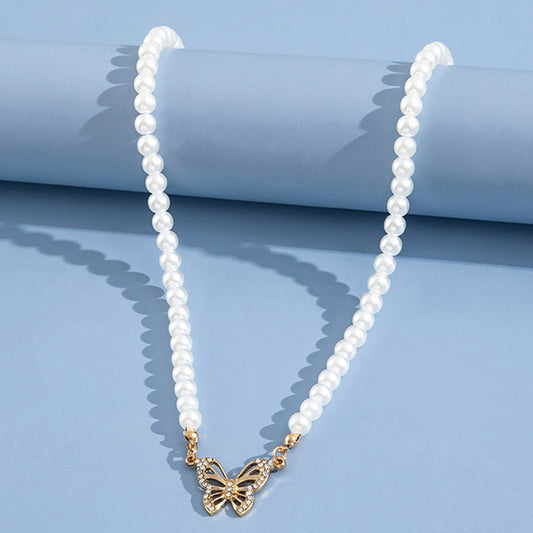 Diamond-set butterfly pendant abs pearl necklace for women