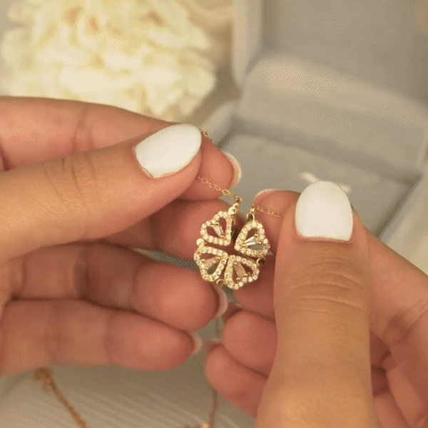 Le collier peut être porté de 2 façons : avec le trèfle porte-bonheur et avec les quatre cœurs romantiques. Le pendentif relie magnétiquement les cœurs au trèfle